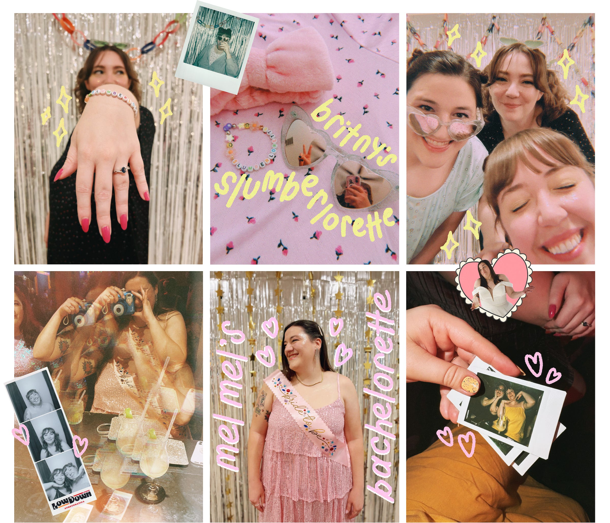 For Britny’s in April, she requested a slumber party (a.k.a. slumberlorette) for just the three of us. Melany and I decided that the theme of the weekend was ~nostalgia~ and really leaned into it. We decorated a photo wall,3 made friendship bracelets, and got coordinating nightgowns and fuzzy headbands. We ate pizza and gummy worms, and drank kamikaze shots and Sex On the Beach (old favorites from nights at Barbarella). We watched The Lizzie McGuire Movie, 13 Going On 30, and Freaky Friday while we put on fun make-up and took a bunch of silly photos, which were all the cutest photo you’ve ever seen. The next morning, we had breakfast at Magnolia Cafe where we surprised Britny with her then-fiancé Tim (and Dylan and Kevin) and toasted mimosas to the 20-something single gals who spent many a late night eating pancakes at Magnolia together.